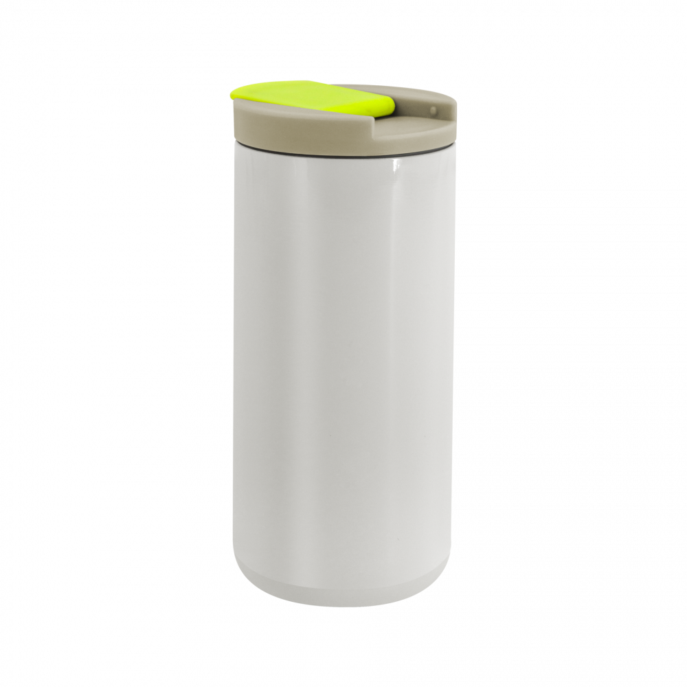 Double-walled thermal mug with twist lid closure and clip lid, keeps drinks hot or cold for up to 12 hours, not dishwasher or microwave safe