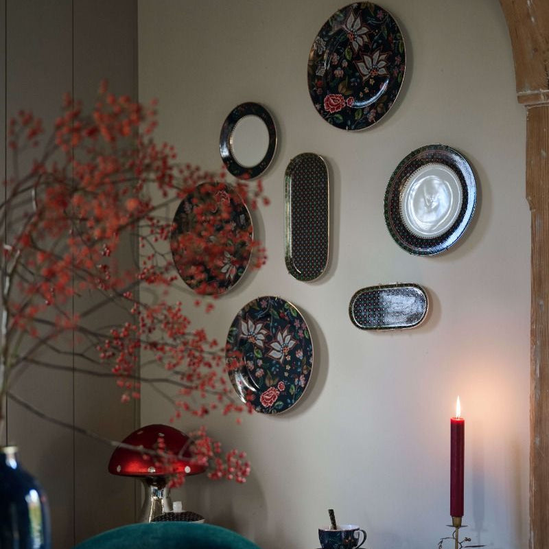 This sugar and creamer plate is part of our Berry Blues collection. The bowl is decorated with a deep green tile pattern with red accents, reminiscent of the well-known winter checks. The edges are finished with gold accents and a surprising red and white stripe, giving the Plate Sugar & Creamer Clover an extra warm and cozy look.