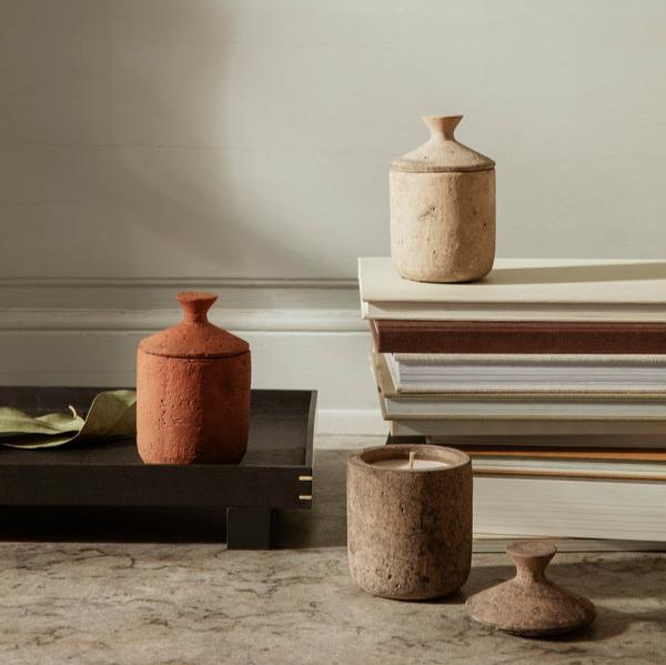 Reminiscent of treasures from the past, the Ura Scented Candle has a unique, raw surface owing to the process of hand pressing the terracotta. Completed with a matching terracotta lid, the scented candle has an earthy expression and invite to moments of relaxation and reflection.